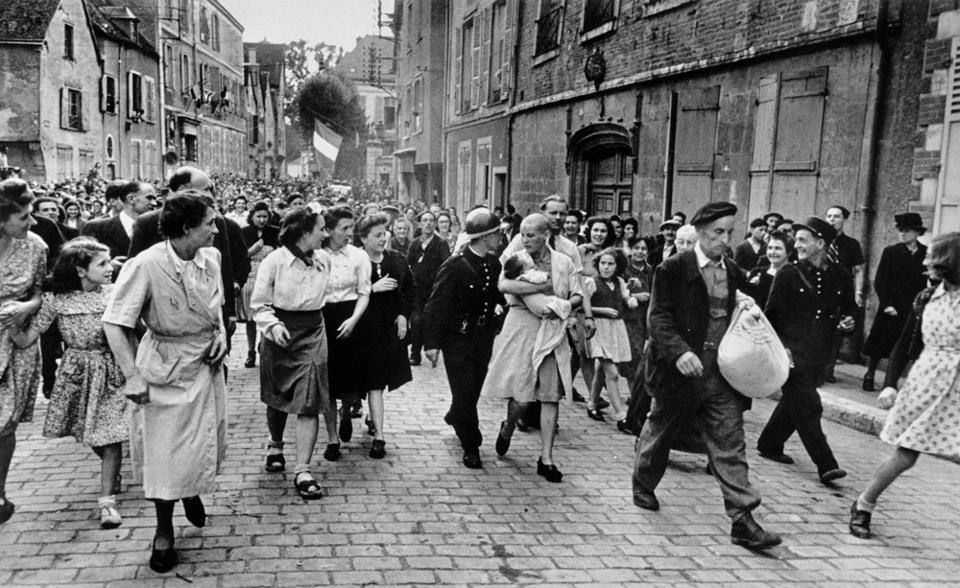 La joven que ocupa el centro visual de la foto es Simone Touseau. Tiene 23 años y lleva en brazos a su hijo, un bebé de menos de un año. Antes del paseo público de escarnio y venganza a Simone le habían rapado el pelo al cero y marcado la frente con un hierro candente. El pueblo la acusaba de “colaboración horizontal” con los nazis, es decir, de haber mantenido relaciones sexuales con un militar alemán en los años de la ocupación de Francia.